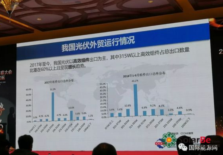我國(guó)光伏對(duì)外貿(mào)易的運(yùn)行情況,王貴清介紹,2013年至今,我國(guó)光伏組件出口數(shù)量呈現(xiàn)增長(zhǎng)趨勢(shì),受貿(mào)易摩擦及國(guó)內(nèi)市場(chǎng)變化影響,組件出口均價(jià)在大幅下降。2017年至今,我國(guó)光伏以高效組件出口為止,其中315W以上高效組件占比較大。