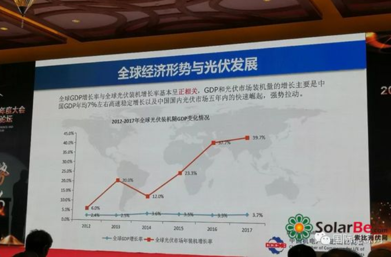 全球GDP增長(zhǎng)率與全球光伏裝機(jī)增長(zhǎng)率基本呈正相關(guān),王貴清表示,GDP和光伏市場(chǎng)裝機(jī)量的增長(zhǎng)主要基于中國(guó)GDP年均7%左右高于穩(wěn)定增長(zhǎng)以及中國(guó)國(guó)內(nèi)光伏市場(chǎng)五年內(nèi)的快速崛起、強(qiáng)勢(shì)拉動(dòng)。