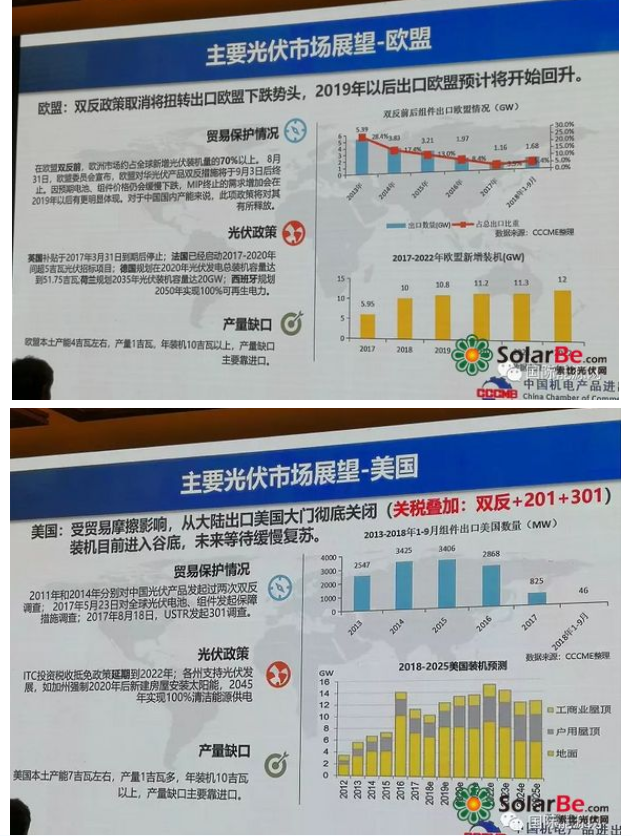對(duì)于未來(lái)光伏市場(chǎng)的展望,王貴清指出,雙反政策取消將扭轉(zhuǎn)出口歐盟下跌勢(shì)頭,2019年以后出口歐盟預(yù)計(jì)將開(kāi)始回升。