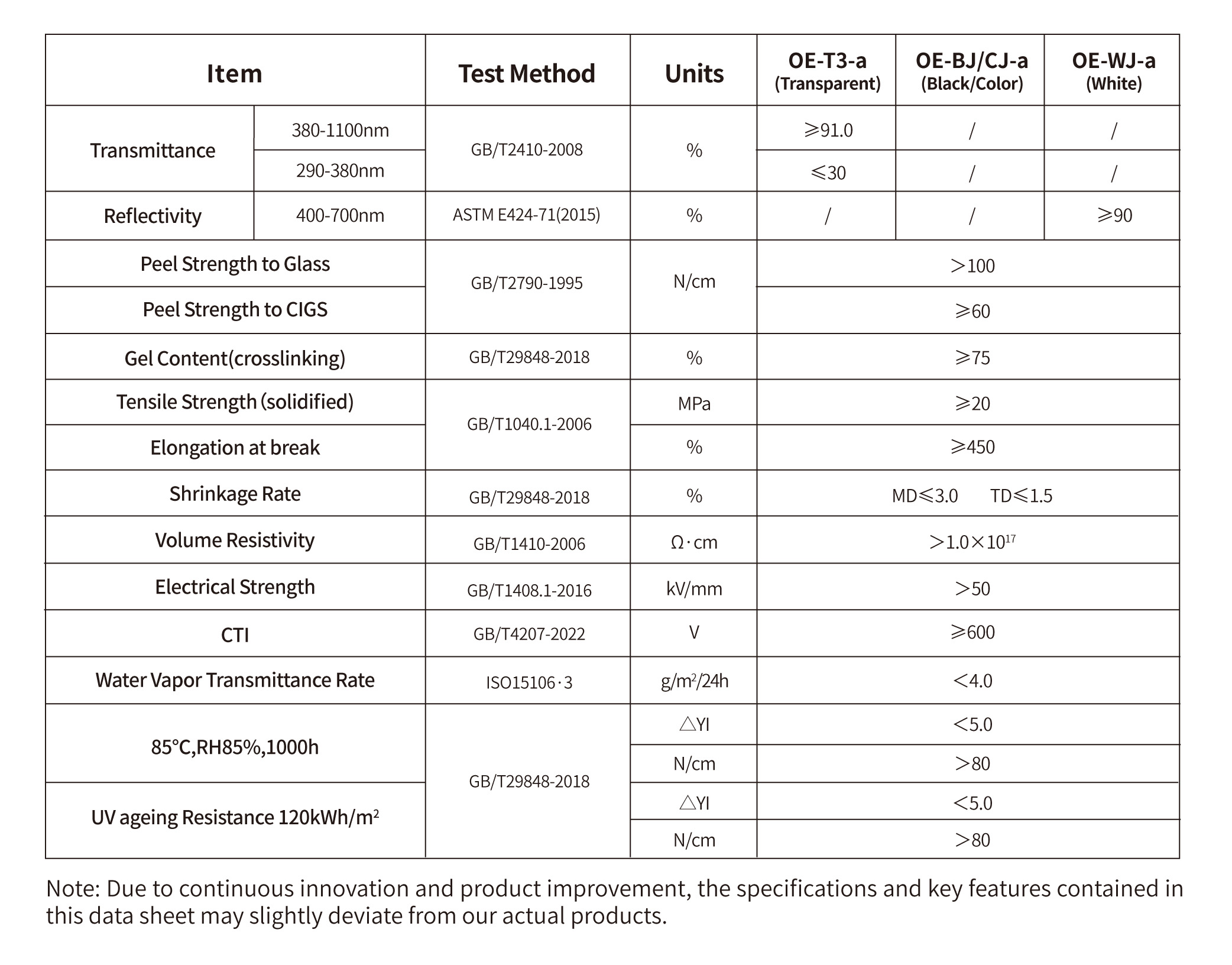 OE-a solar encapsulation film is EVA raw material based, adopting graft modification technology, which greatly improved EVA film’s performance, OE film combines the advantages of POE and EVA, which not only has excellent anti-PID performance of POE, but also has excellent adhesion.