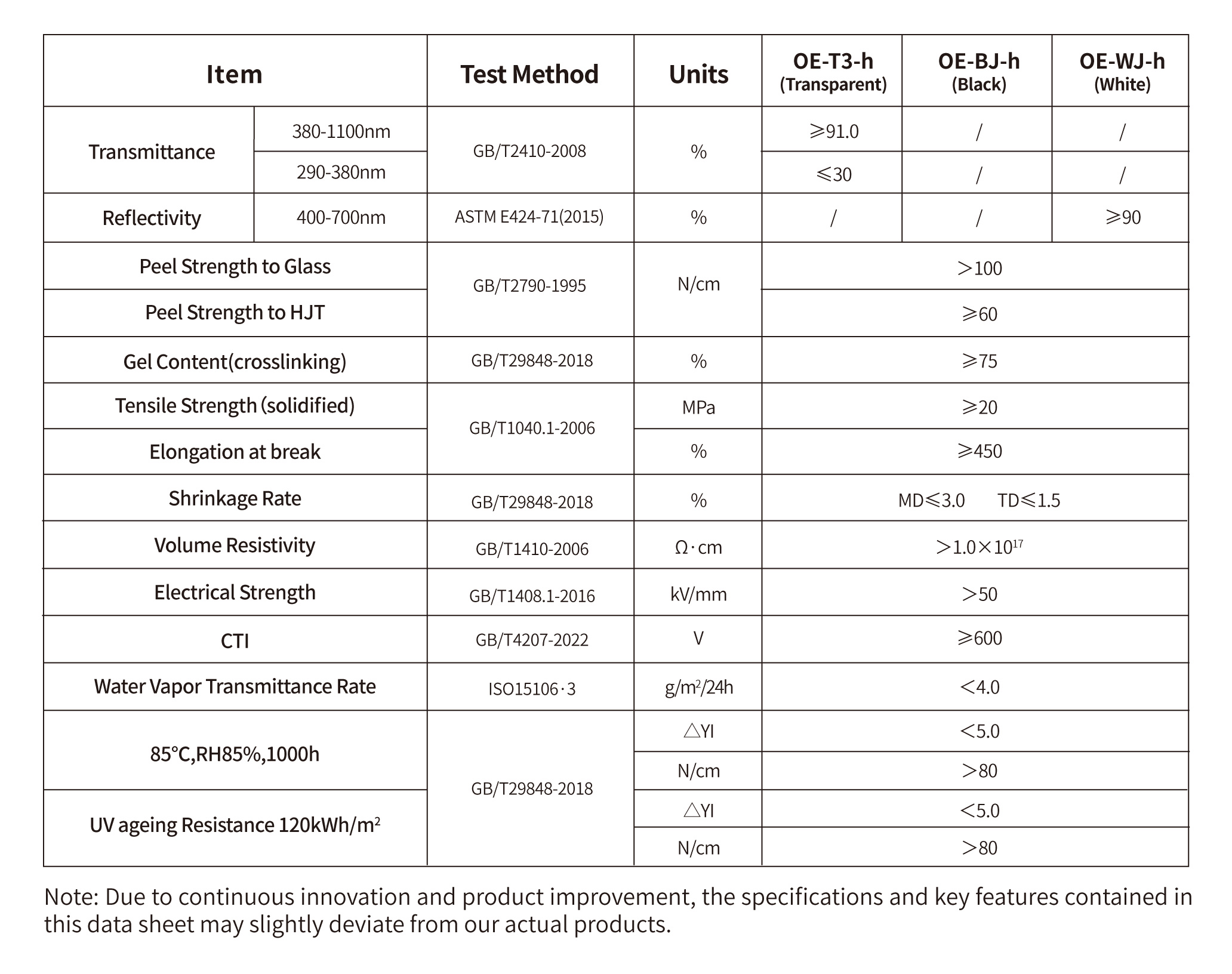 OE solar encapsulation film is EVA raw material based, adopting graft modification technology, which greatly improved EVA film’s performance, OE film combines the advantages of POE and EVA, which not only has excellent anti-PID performance of POE, but also has excellent adhesion, high light transmittance and good lamination performance of EVA, meanwhile OE film maintain high electrical strength and CTI. OE series film are TUV certified.