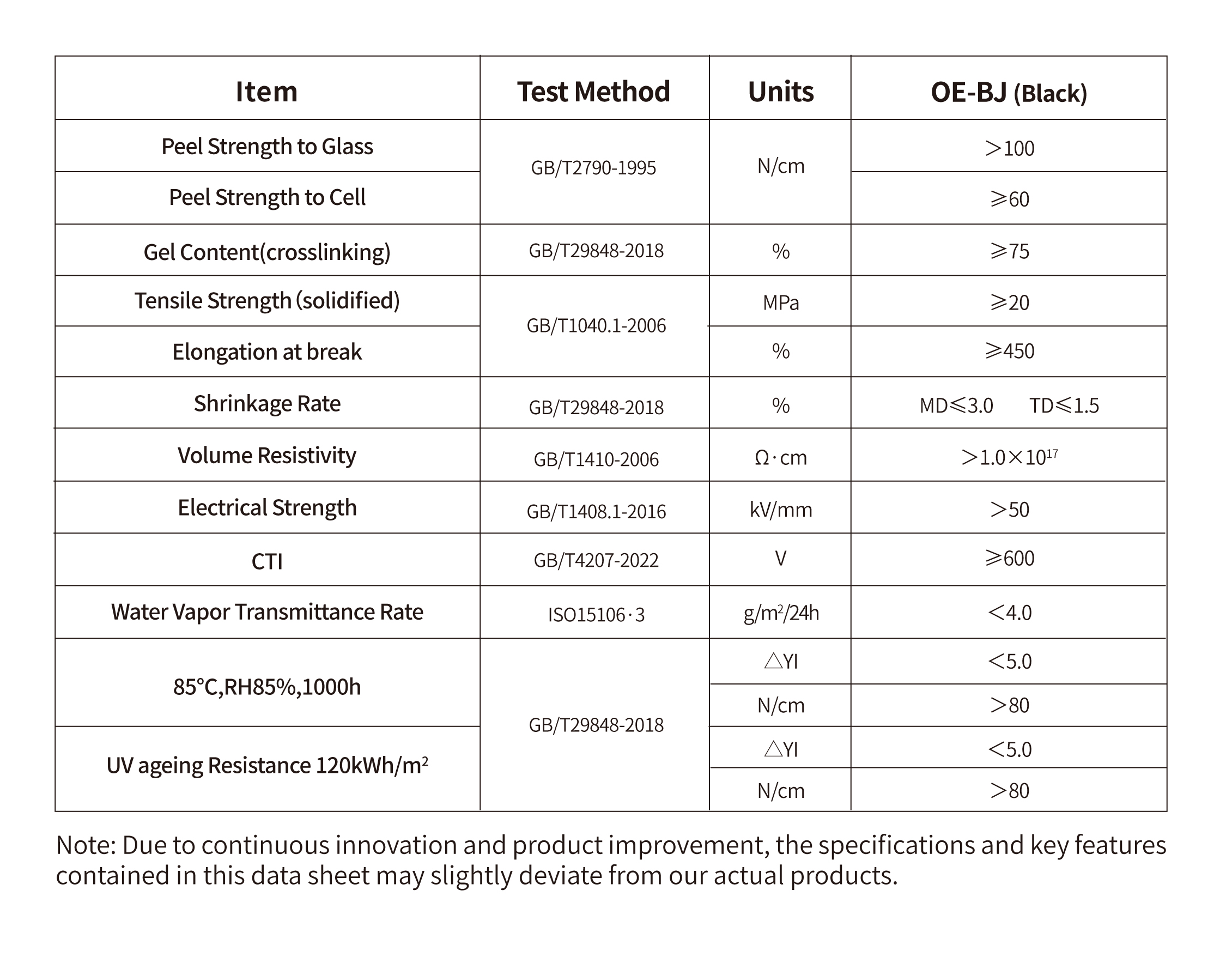 OE solar encapsulation film is EVA raw material based, adopting graft modification technology, which greatly improved EVA film’s performance, OE film combines the advantages of POE and EVA, which not only has excellent anti-PID performance of POE, but also has excellent adhesion, high light transmittance and good lamination performance of EVA, meanwhile OE film maintain high electrical strength and CTI. OE series film are TUV certified.