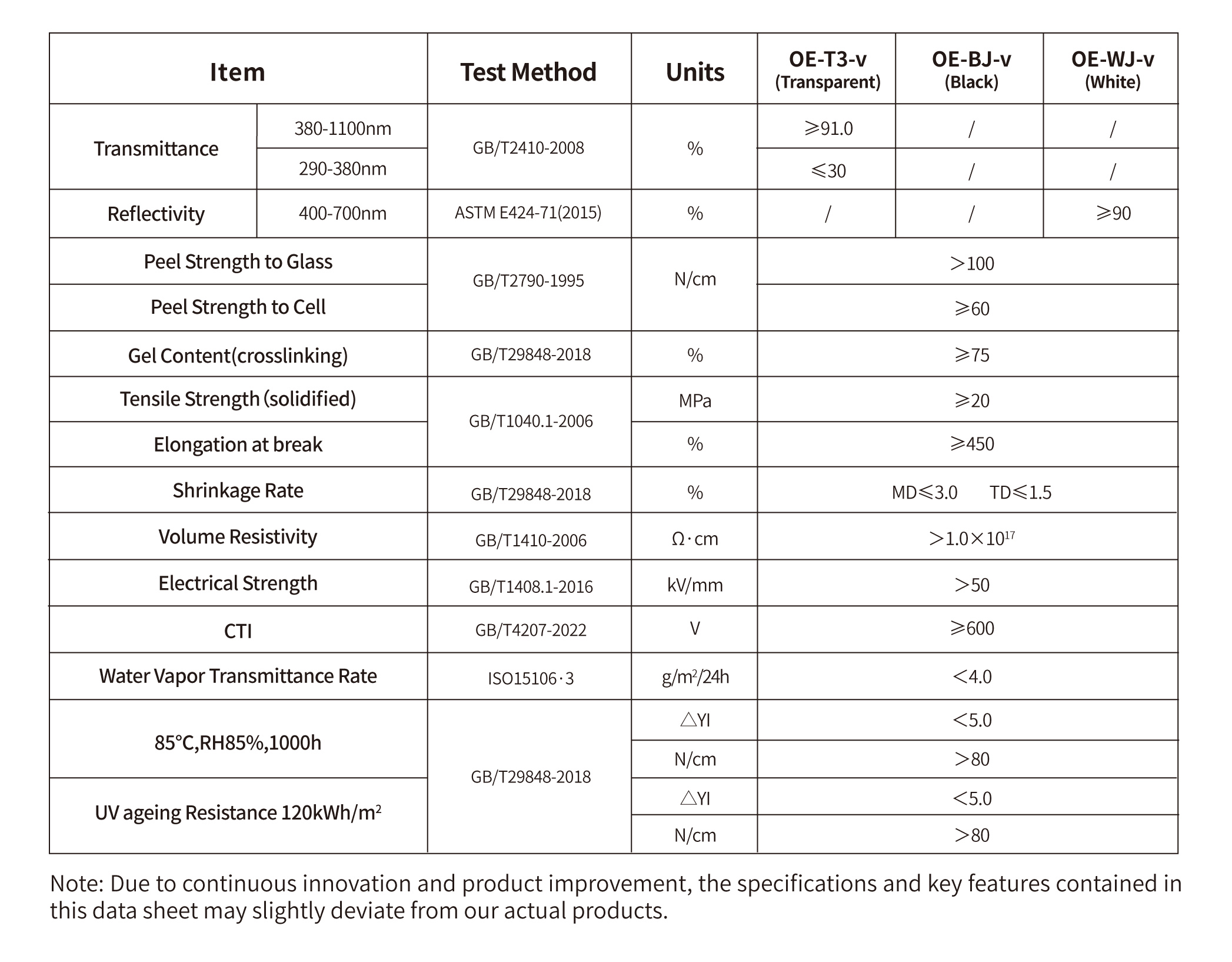 OE-v series solar encapsulation film is EVA raw material based, adopting graft modification technology, which greatly improved EVA film’s performance, OE film combines the advantages of POE and EVA, which not only has excellent anti-PID performance of POE, but also has excellent adhesion, high light transmittance and good lamination performance of EVA, meanwhile OE film maintain high electrical strength and CTI. OE series film are TUV certified.