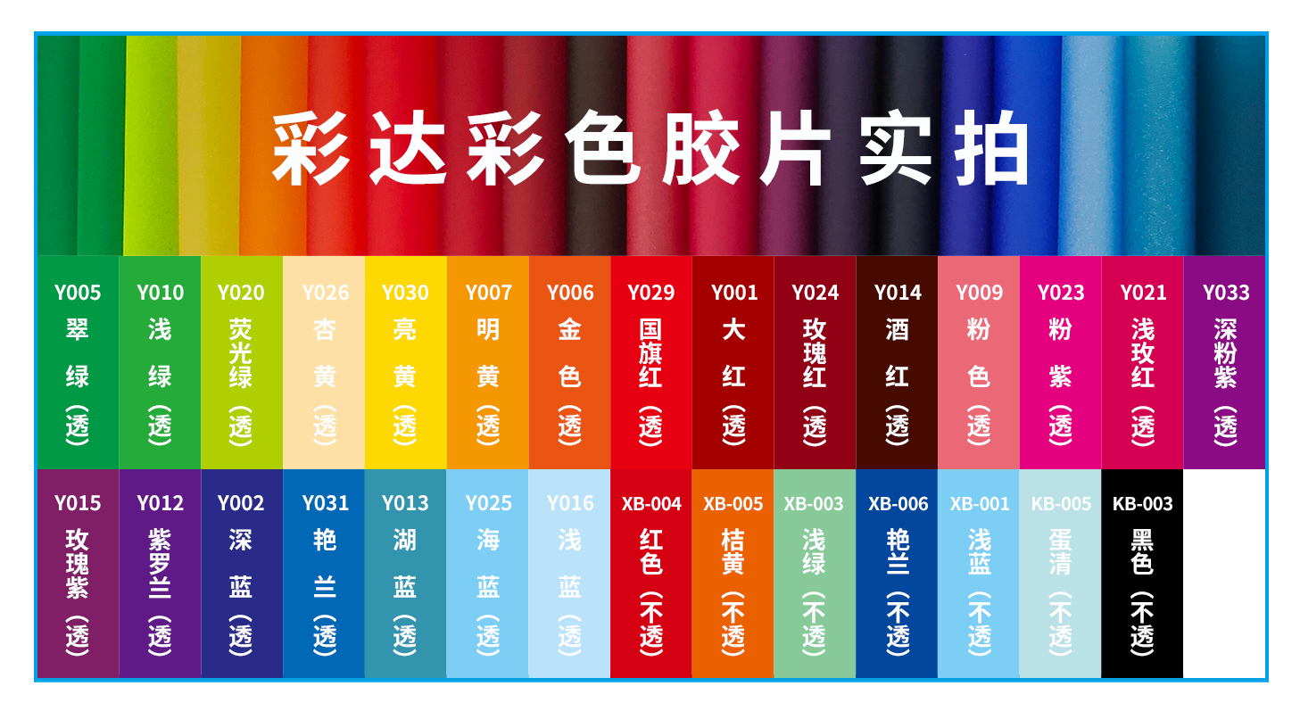 彩色系列膠片包含30余種顏色,色彩純正、不易褪色,同時(shí)可以根據(jù)客戶需求定制產(chǎn)品。